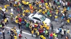 Sebilangan peserta mengusung lelaki yang terpelanting ke ambulans sementara sebilangan lain membawa keluar seorang polis dari kereta itu.
